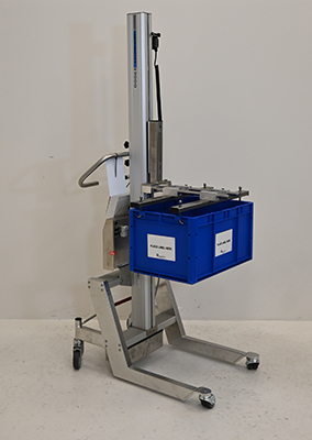 Regarding this project, when the operator is in need of product, they take the lifter and manually push it to the storage rack of product located in the staging queue. The operator would position the lifter, while lowering the custom Tote Handling tooling, so it is directly over the next available product.