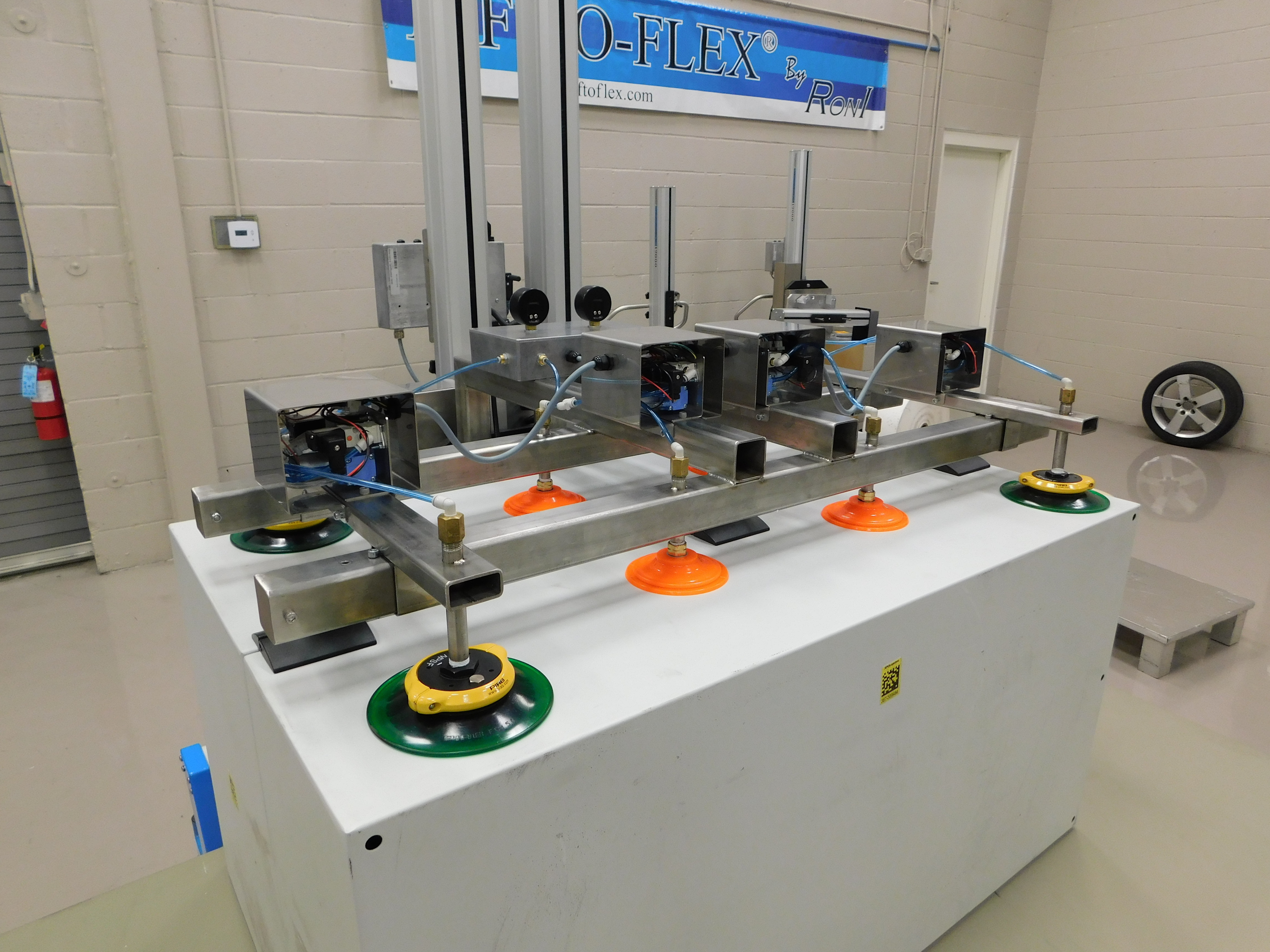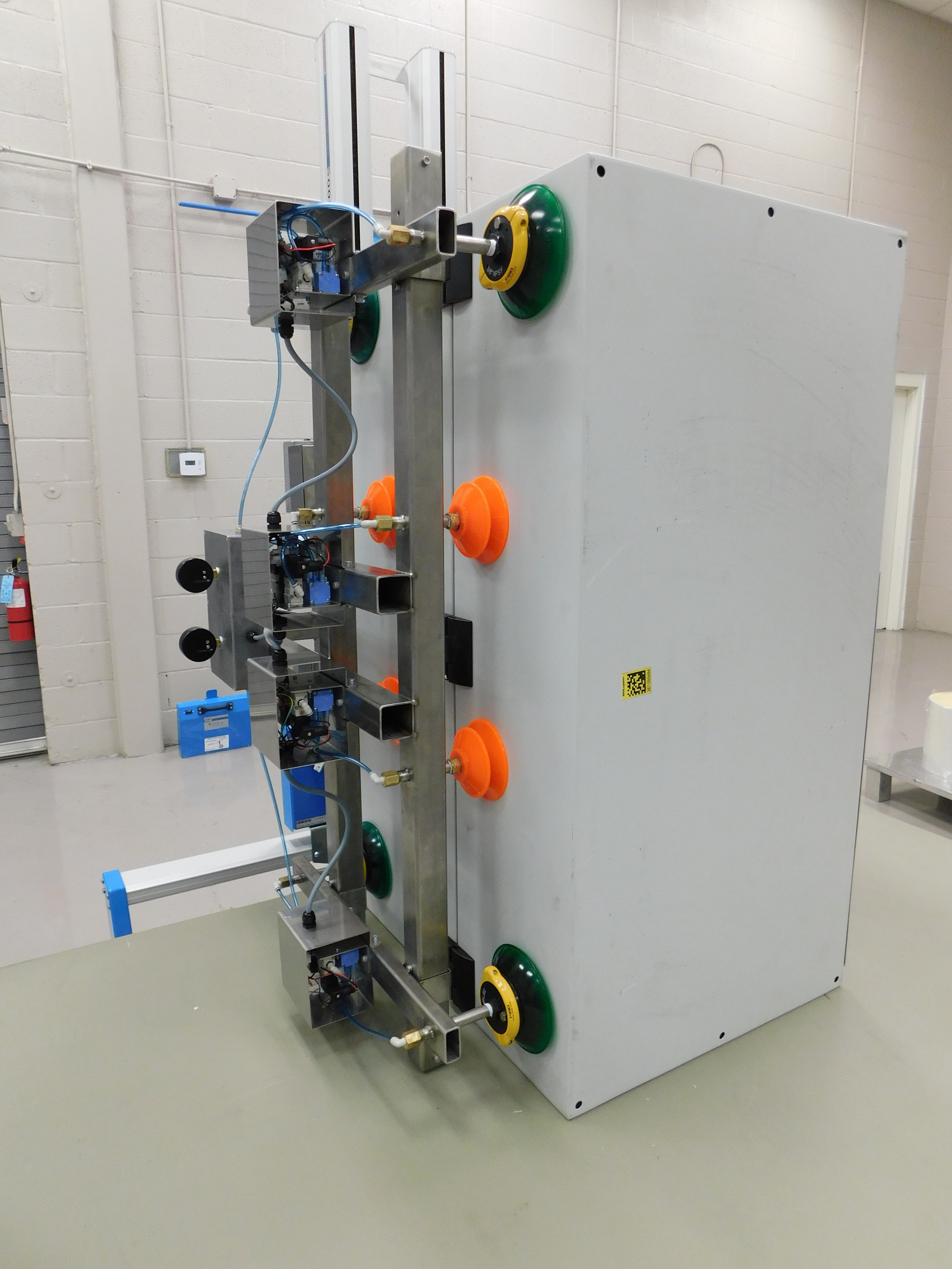 This lifter utilizes (8) vacuum grippers to pick up a metal case from the horizontal position and rotate it to the vertical position. The vacuum tooling uses (4) small suction cups located on the inside of the tooling arms and (4) large suction cups located on the outside of the tooling arms. The production team made sure to spread out the vacuum cups in order to firmly grip the metal case.