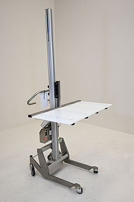 In this example, when the operator is in need of product, they obtain a lifter and manually direct it to a pallet of product located in the staging queue. Once in place, the operator manually locks the brake on the lifter and lowers the platform to the proper position. After positioning, the operator then moves to the front of the lifter and slides the load on the platform. The operator then releases the brake, and moves the lifter to the area that requested the product and offloads it. After offloading, the operator moves the lifter back to its waiting position to await the next transport. Maximum lift height floor to top of this platform was 69”.