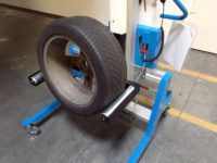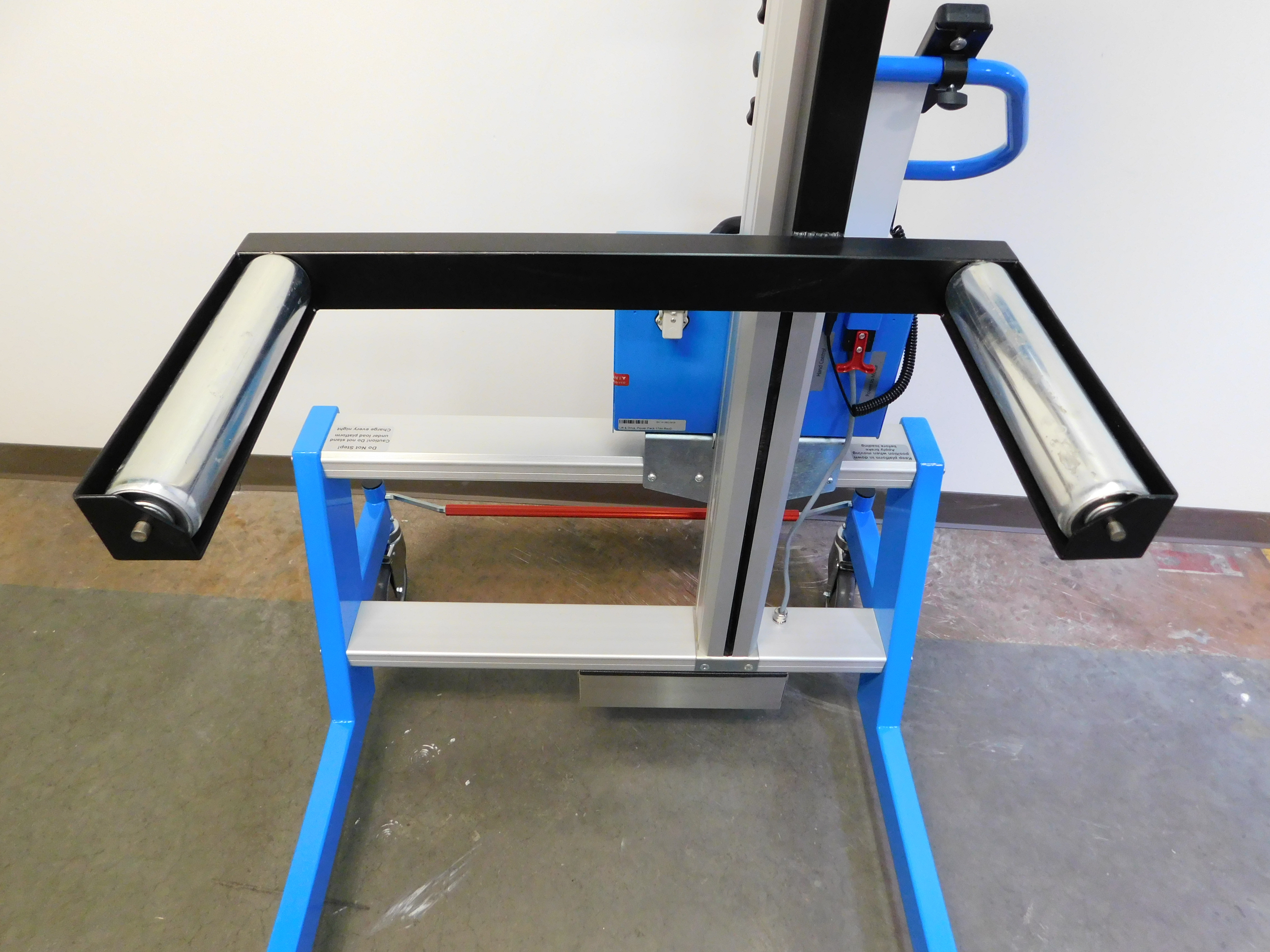 This lifter is used in the Automotive industry to support tires. The tires are loaded onto the roller bars and the lifter forks can be raised to a comfortable height for the user.