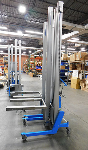 In this application, the lifter was provided with custom telescopic length forks for handling rail sections with a maximum weight of 350 lbs. The forks measure 24” outside to outside x 27.4” long. The lifter unit will be assisting installation of track spanning from the floor to the ceiling. We also included an adjustable upper travel limit switch for the customer to set the high drop off position.