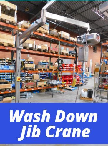 What is a Wash Down Jib Crane with a Chain Hoist? The crane below is being used to pick up (2) 100 lb bags by engaging a hook into a re-enforced round bag opening. The bags need to be lifted and swung to a position where the product will be discharged. This range is 30″ to 84″ from the crane column. The top of the outer arm cannot exceed 8’9″. The crane will have a 1500 mm inner arm and a 1000 mm outer arm. The area will be a wash down environment.